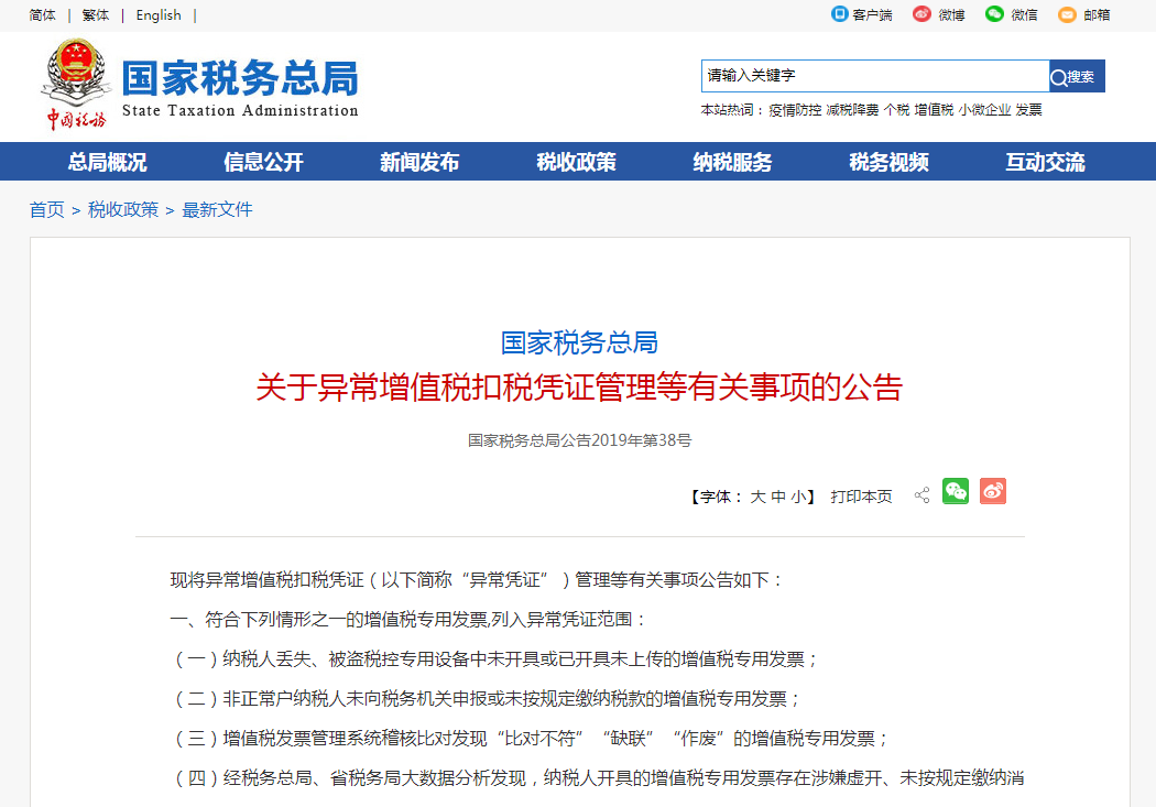 《國家稅務(wù)總局關(guān)于異常增值稅扣稅憑證管理等有關(guān)事項的公告》(國家稅務(wù)總局公告2019年第38號)